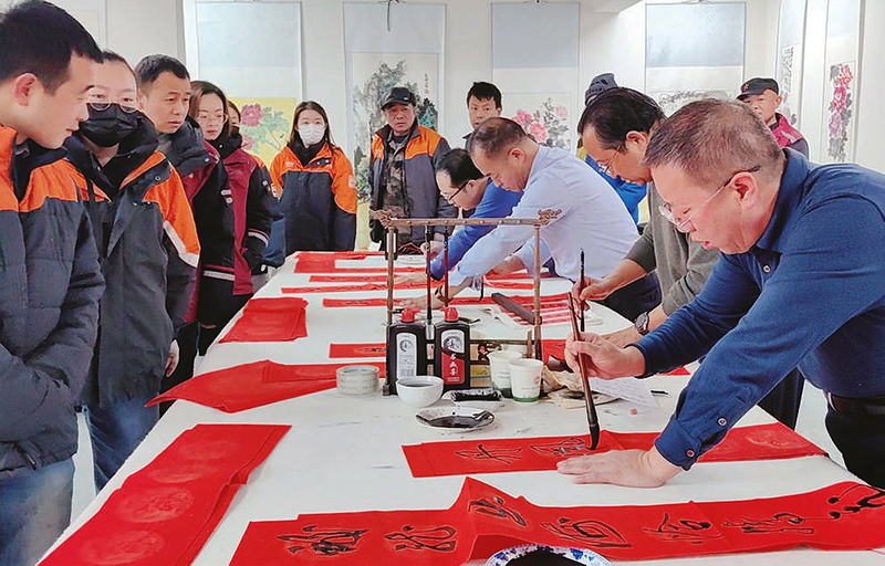1月19日,右玉县总工会与县书协联合举办“写对联、送福字、迎新春”公益活动,组织书法爱好者现场挥毫泼墨,为劳模、工匠和快递员、外卖员等新就业形态劳动者书写春联和福字,表达对广大劳动者的尊重和敬意,及时传递党的关怀和工会娘家人的温暖与祝福。 赵福胜王泽 摄
