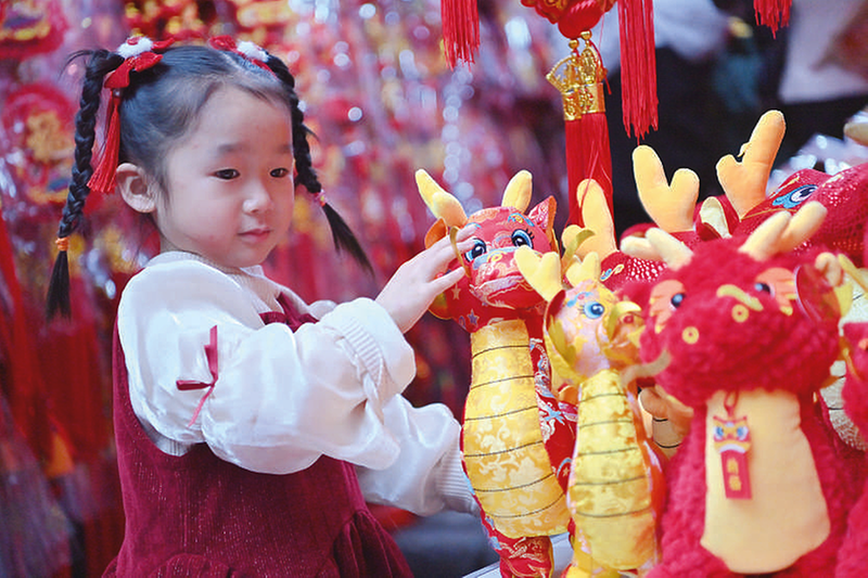 2月3日,小朋友在广西南宁交易场附近的摊位上选购春节饰品。随着春节临近,广西南宁迎来春节饰品销售旺季,众多市民采购春联、窗花等,喜迎新春。