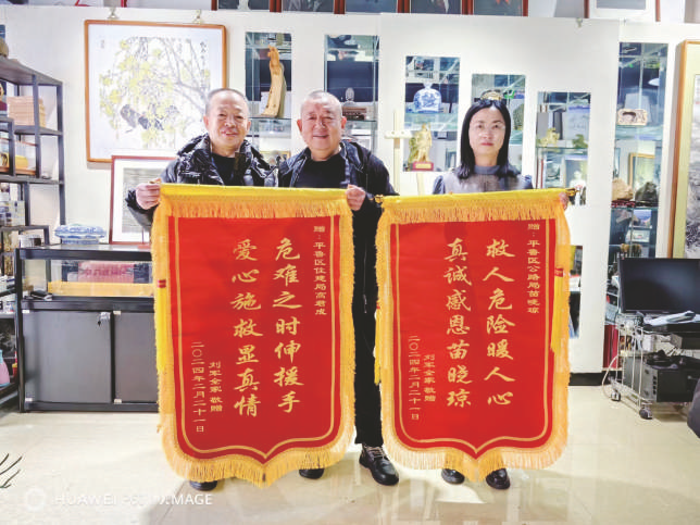 本报讯“两位恩人,太感谢了!你们是我家的大恩人,你们的义举挽救了我家孩子的生命。”近日,朔城区滋润乡南西河底村村民刘军全家将金字锦旗赠予朔州市摄影家协会两位会员高君成、苗晓琼。