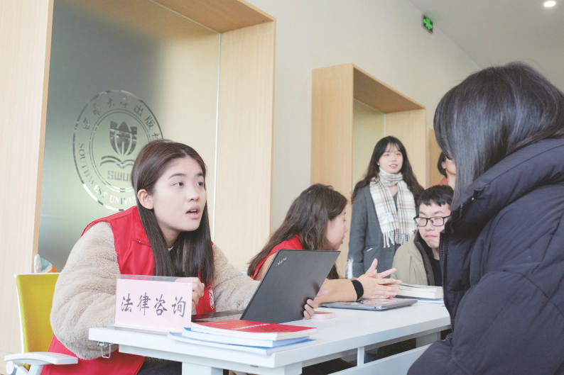 3月3日,在西南大学学生园区志愿服务活动现场,大学生志愿者在给同学提供法律咨询服务。当日,西南大学举行“追‘锋’少年在行动——学生园区志愿服务嘉年华”活动。“红帽子”“及时雨”“补衣坊”“西小兰”等多支该校大学生志愿服务队的成员为在校同学提供志愿服务,以实际行动践行雷锋精神。