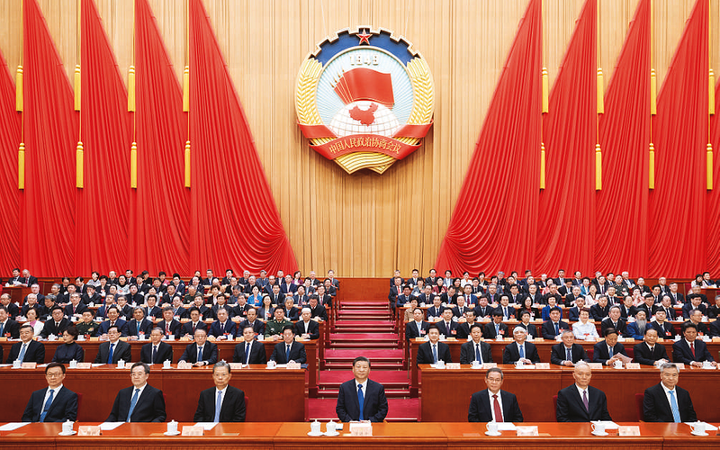 3月10日上午,中国人民政治协商会议第十四届全国委员会第二次会议在北京人民大会堂闭幕。这是习近平、李强、赵乐际、蔡奇、丁薛祥、李希、韩正在主席台就座。