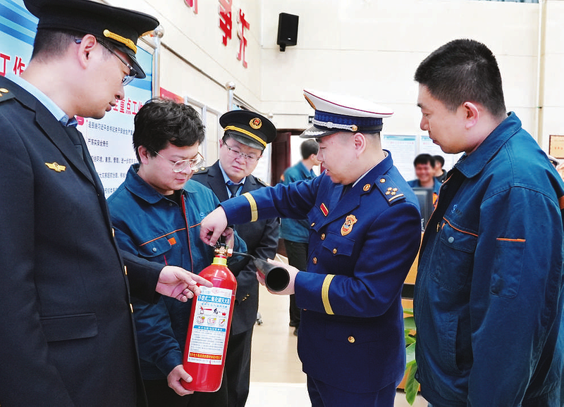 3月12日,国家矿山安全监察局山西局监察执法三处联合朔州市消防支队新开消防救援大队在平朔井工一矿开展地面建筑场所专项检查。图为检查人员对办公楼灭火器进行检查。 薛礼伟刘浩东摄