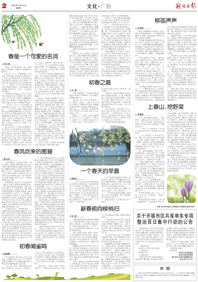 丰子恺笔下的春是铿锵而惺忪可爱的。第一次看到这样的描述,铿锵而惺忪,让人有了愉悦之感。他写道:“春是多么可爱的一个名词!自古以来的人都赞美它,希望它常在人间。诗人,特别是词客,对春的爱慕尤深。试翻词选,差不多每一页上都可以找到一个春字。”是啊,古时的文人墨客,流传的诗词,对春的赞誉比比皆是。春的可爱不言而喻,在诗中品味春更是无限的春意融融。
