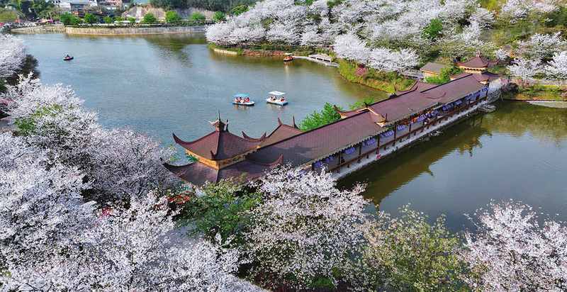 3月24日,游人在泸州市江阳区丹林镇建设村“樱花谷”泛舟赏樱。近日,四川省泸州市江阳区丹林镇建设村“樱花谷”景区大面积樱花盛开,引来市民和游客踏青赏景,拥抱春天。 新华社发 刘学懿 摄