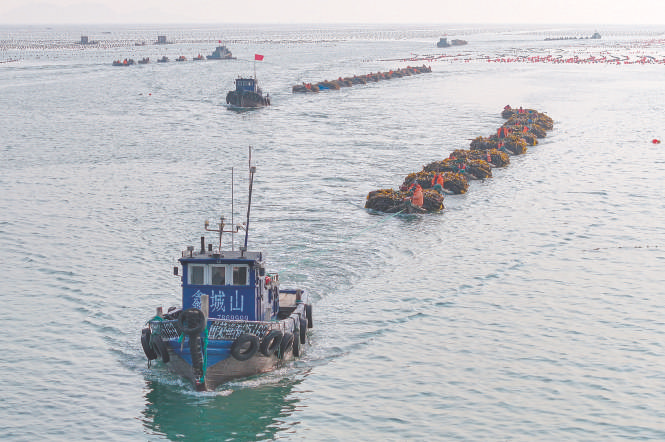 4月8日,在山东省荣成市俚岛湾海域,养殖工人驾驶满载海带的渔船返回码头。眼下正值海带收获季节,连日来,在山东省荣成市沿海各处海带晒场,养殖工人趁着晴好天气,抓紧采收、搬运、晾晒海带,海岸线一派繁忙景象。 新华社发李信君摄