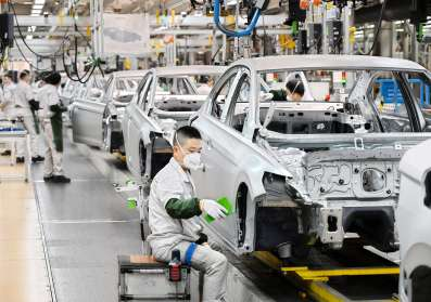 4月9日,工人在位于青岛市即墨区的一汽-大众青岛基地总装车间工作。