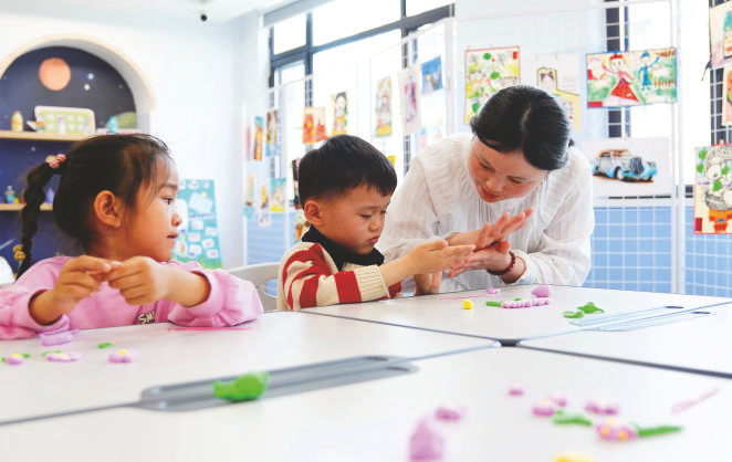 4月14日,在菏泽市巨野县凤凰社区党群服务中心,志愿者在公益“周末课堂”上教孩子捏橡皮泥。山东省菏泽市巨野县2023年以来整合资源,按照规模适度、经济实用和服务高效的原则,建设15处城市社区嵌入式服务设施——党群服务中心,面向社区居民提供养老托育、社区助餐、家政便民、健康服务、体育健身、文化休闲、儿童游憩等服务,让社区居民就近就便享受到优质普惠公共服务。 新华社记者郭绪雷 摄