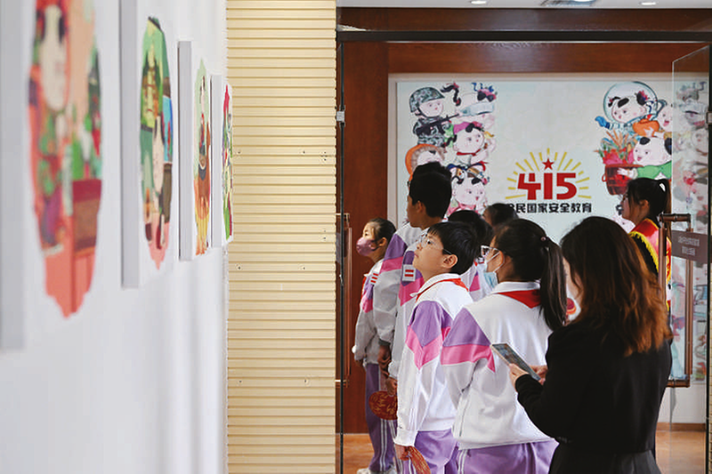 4月15日,小学生在参观国家安全年画娃娃艺术展。
