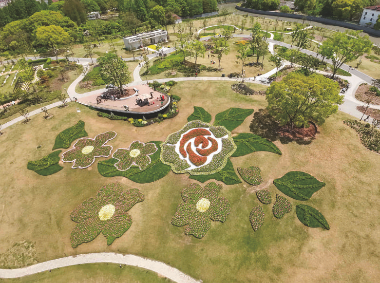 4月18日在上海植物园主会场拍摄的月季花坛(无人机照片)。