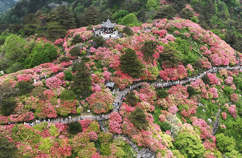 近日,湖北省麻城市龟峰山景区的十万亩连片杜鹃花进入盛花期,吸引各地游客前来赏花。龟峰山景区天然古杜鹃群落平均树龄在百年以上,每年春季,集中连片的杜鹃花绽放,形成红色花海,美不胜收。