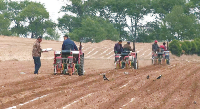 在朔城区高升农机专业合作社的千亩有机旱作种植基地,多台春耕机械在田间来回穿梭,撒肥、播种、覆膜、滴灌铺设同步进行,平均每天可以完成150亩左右的高粱种植任务。