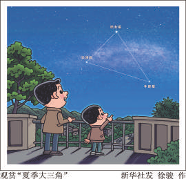 “夏季大三角”已经“上线”,感兴趣的公众不妨找个晴夜,抬头看一看这个夜空中的“几何图形”,辨认一下织女星、牛郎星和天津四。如果条件允许,也可以到郊外好好观赏一番在这个“大三角”中横穿而过的灿烂银河,感受星空的瑰丽与壮美。