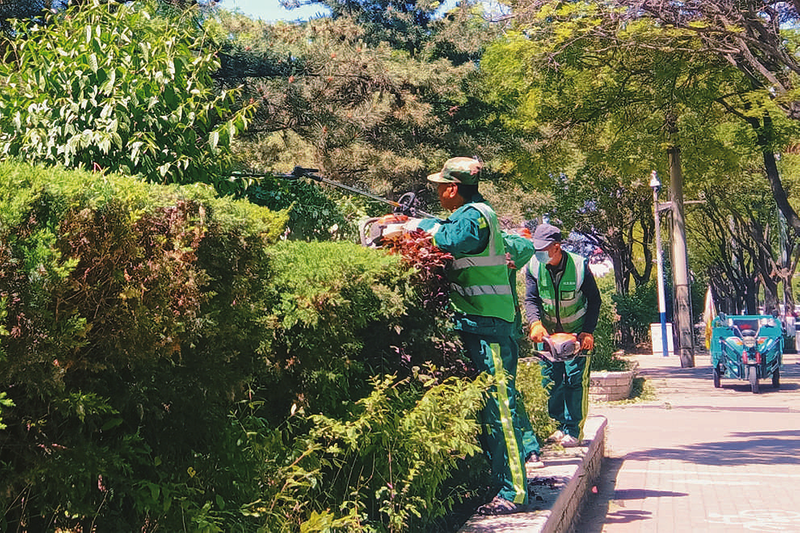 为确保道路绿化整体美观效果,连日来,我市园林管护工作者抢抓有利时机,开展绿植修剪工作。图为工人们正在对道路两旁的绿化带进行修剪,并及时清理散落的枝条、落叶,保持绿化带和道路的干净整洁。 赵福胜 摄