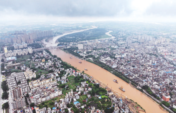 5月26日,施工队在疏浚平陆运河流经钦州市区的航道。近日,广西平陆运河建设施工队伍抢在汛期来临前,开展拆除钦江江面老桥、疏浚河道等工作。新华社记者
