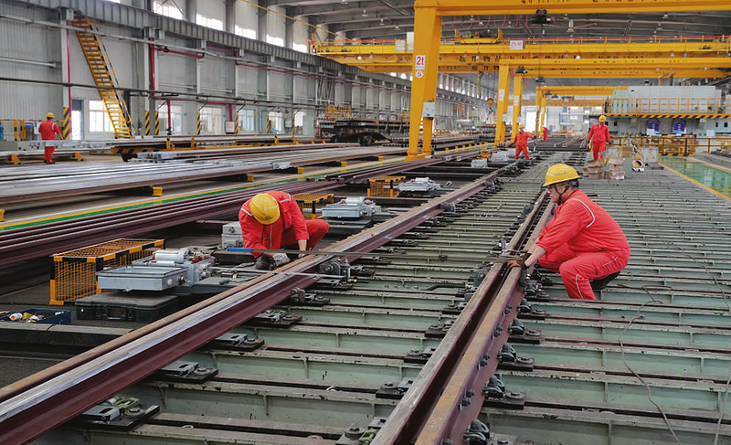 6月11日,河北省秦皇岛市山海关区中铁山桥集团有限公司的工人在道岔生产车间工作。近日,随着国内一些重要铁路及地铁项目有序推进,承接铁路道岔生产任务的河北省秦皇岛市山海关区中铁山桥集团有限公司生产车间内一派繁忙,工人们正保质保量加紧生产,助力中国铁路交通建设。中铁山桥始创于1894年,生产的道岔产品远销30多个国家和地区。 新华社记者 杨世尧摄