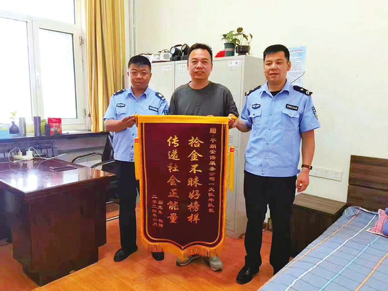本报讯 近日,市民蒯先生将一面印有“拾金不昧好榜样 传递社会正能量”字样的锦旗送到了中煤平朔集团安保服务公司护卫一大队执勤队长牛辉手中,对牛队长拾金不昧的传统美德表示赞扬,并对护卫一大队长期以来在生活区各项工作给予了充分认可。
