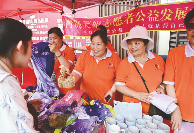 6月17日,在青岛市市北区易州路广场邻居节20周年社区服务大集上,社区工作人员在进行爱心义卖。
