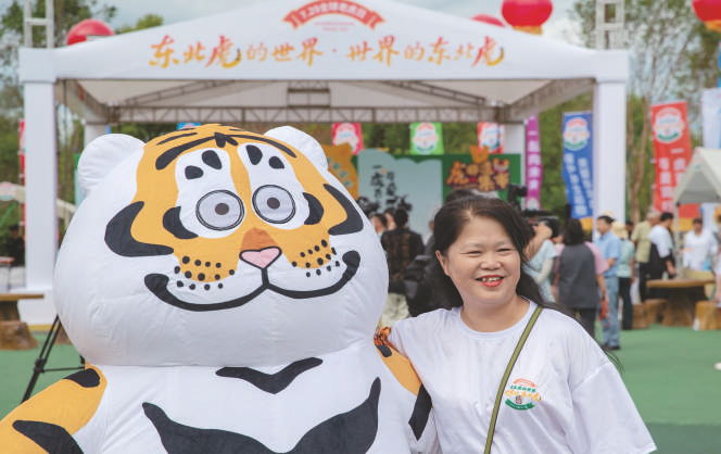 7月29日,在黑龙江东北虎林园,东北虎粉丝现场与胖虎吉祥物合影。