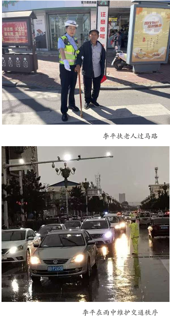 一天,一场突如其来的暴雨席卷了整个县城,街道上水流成河,车辆拥堵、行人匆忙,交通状况一度陷入混乱,李平在雷雨交加的灰色天幕下镇定自若,顶着倾盆大雨,迅速调整指挥手势,疏导车辆有序通行。她湿透的衣服紧紧裹在身上,衣袂淋着水,在雷雨声不时掩没他的声音的情况下,她反复耐心地安抚着行色仓皇、面容焦急的群众,提醒他们注意安全。除了恶劣天气的挑战,她还时常面临其他考验。有时驾驶员因违规驾驶与她产生争执,她始终保持着冷静与耐心,以理服人、以情动人、依法处置。