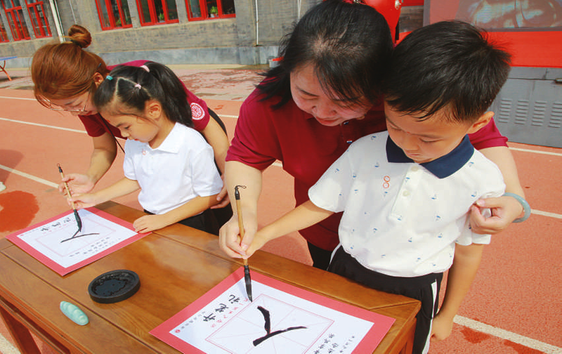 9月1日,在北京市东城区府学胡同小学举行的开学典礼上,老师带着一年级新生行“开笔礼”。当日,北京市中小学开学,师生迎接新学期。