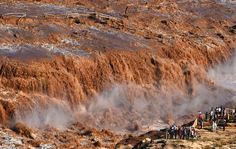 9月12日,游客在山西吉县黄河壶口瀑布欣赏“金瀑飞流”景观。