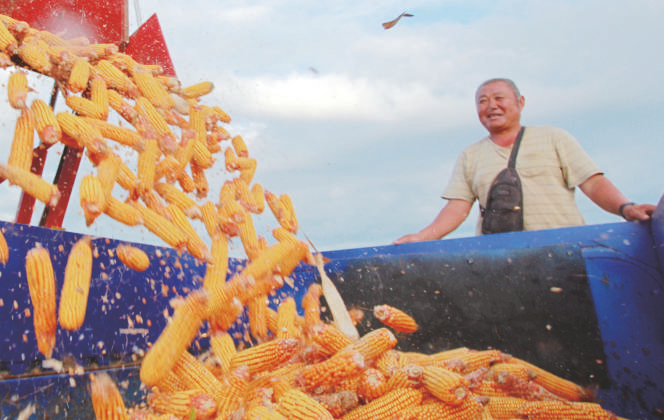 9月17日,山东省临沂市平邑县卞桥镇农民将收获的玉米装车。
