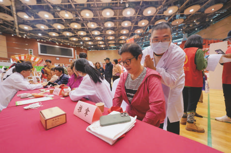 10月10日,北京中医药大学中医学院的志愿者在月坛体育馆为老人服务。当日,2024年北京月坛街道重阳节为老服务市集活动在月坛体育馆举行。北京中医药大学中医学院的志愿者用自己所学的专业知识在市集上为老年人服务,迎接重阳节。 新华社记者邢广利 摄