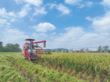 金秋十月,各地的农作物逐渐成熟,农民抢抓农时忙秋收,田间地头处处好“丰”景。图为在湖南省永州市道县四马桥镇燕山脚村,农机手驾驶机械收割晚稻(无人机照片)。