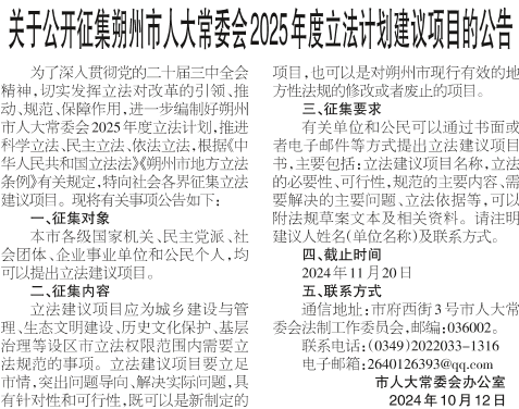 关于公开征集朔州市人大常委会2025年度立法计划建议项目的公告