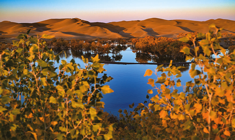 这是葫芦岛景区内胡杨林和沙山。新疆塔里木河流域分布着上千万亩胡杨林,金秋时节,层林尽染。葫芦岛景区地处塔里木河下游、塔克拉玛干沙漠东缘,这里集沙漠、湖泊、胡杨于一体,美不胜收,吸引着天南海北的游客慕名而来。