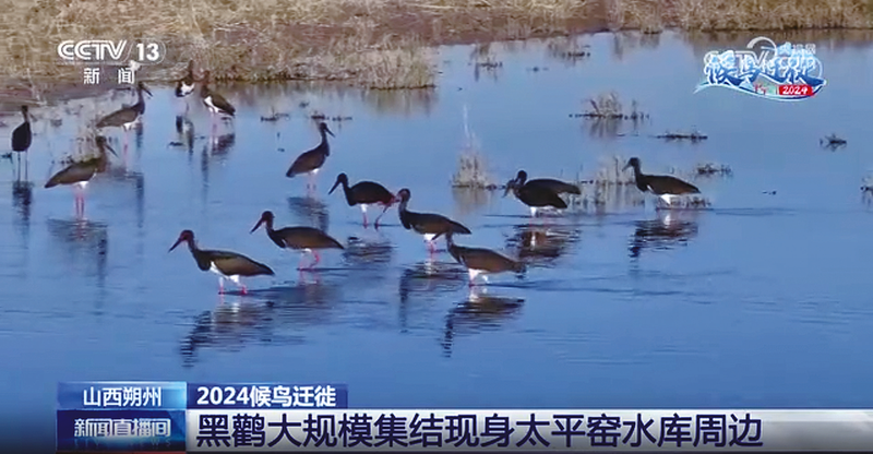 除此之外,在水库的浅滩处,还发现一些正在觅食的鸟儿。比如说,这个毛色发黑的是黑鹳,毛色发灰的是苍鹭,嘴巴扁长像小勺子的是琵鹭。它们正在来回踱步觅食,互不打扰,和谐共处。在水库的中心位置,有一群鸬鹚也给鸟岛勾出了黑边,它们可是捕鱼的高手,说不定这会儿正在寻找猎物,一旦发现目标马上就会潜入水中捕食。有的鸬鹚能在十几米的水下深潜超过一分钟,所以它们也是潜水的高手。根据监测,今年已经有接近40种的候鸟都来到了太平窑水库,是有统计数据以来种类最多的一年。这当中有不少都是国家的一级保护动物,甚至是濒危的珍禽。比如说黑鹳,现在黑鹳的数量在全球范围内只有两千多只。但是根据监测,今年出现在水库周边的黑鹳已经有将近70只。在前一段时间,这些小家伙们已经开启了它们的南迁之路。根据当地的摄影爱好者在前段时间拍下的图片中可以看到,腿和嘴都呈褐灰色的是亚成年的黑鹳,其余的是成年黑鹳。它们对于生活的环境很挑剔,觅食的水域需要有丰富的食物,而且水质清澈。因此黑鹳的出现也是对于当地生态环境向好的一种褒奖。