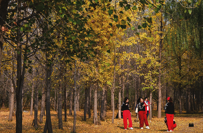 11月20日,在黄河济南槐荫段千亩银杏林,游人在拍照、游玩。