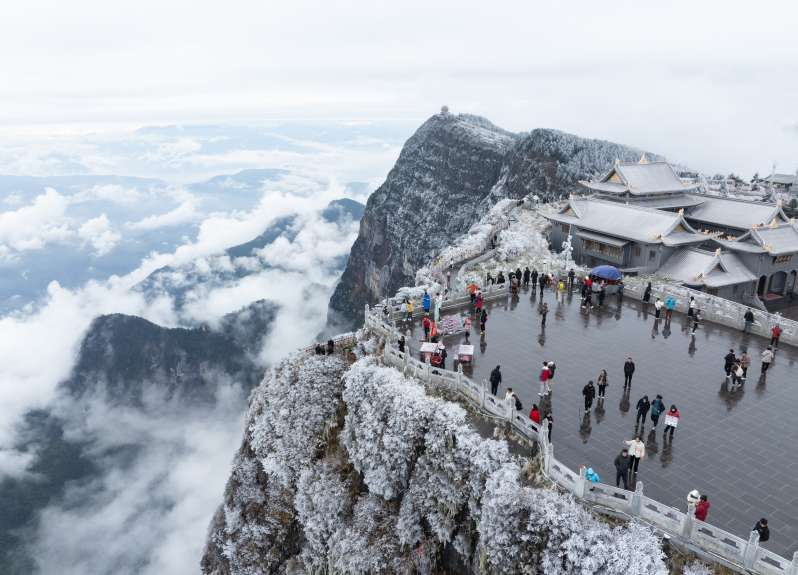 11月20日,游客在峨眉山金顶远眺群峰与云海(无人机照片)。近日,峨眉山迎来今冬第一雪,奇峰、林海、云雾与冰雪绘就了一幅幅银装素裹的美丽画卷。