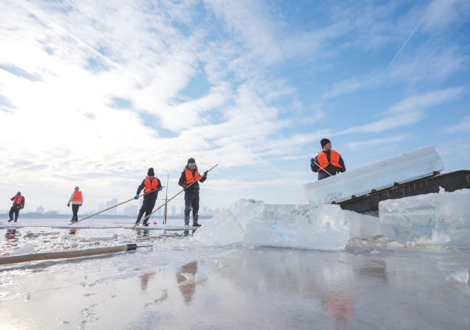12月9日,工人在松花江哈尔滨段采冰。眼下,“冰城”哈尔滨采冰工作全面展开,采冰汉子从松花江上采出优质冰料,源源不断地运往冰雪大世界园区等地,用于景观建设。 新华社记者 王建威 摄