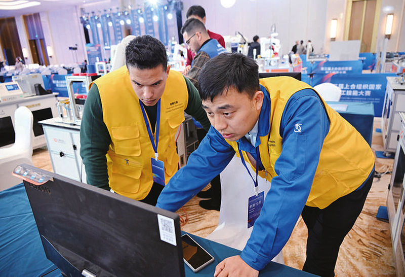 12月18日,来自中国的王京京(前右)与来自埃及的穆斯塔法·霍斯尼·穆斯塔法·梅特瓦利在工业机器人操作调整工项目比赛后交流。