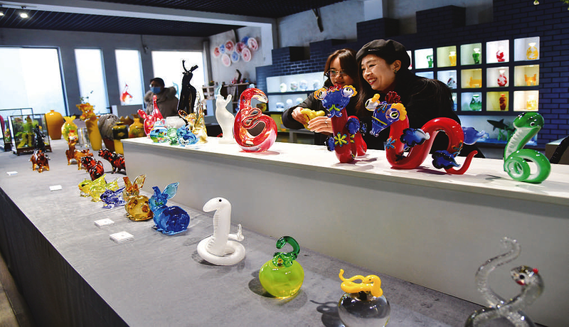 1月9日,消费者在淄博市博山区西冶工坊展销厅内挑选蛇年主题琉璃工艺品。春节临近,山东省淄博市博山区的琉璃生产企业推出众多蛇年主题创意琉璃制品,受到市场青睐。博山区被誉为“中国琉璃之乡”,琉璃生产历史悠久,当地已发展琉璃生产企业12家、工作室65个。 新华社记者 朱峥 摄