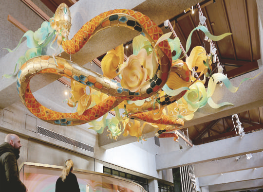 1月9日,参观者走在“灵蛇·生生不已”蛇年特展现场。当日,宝格丽在上海张园举办的“灵蛇·生生不已”蛇年特展拉开帷幕。宝格丽的灵蛇元素古董典藏、当代珠宝和腕表,以及众多中外艺术家灵蛇图腾主题艺术作品在展览中亮相。
