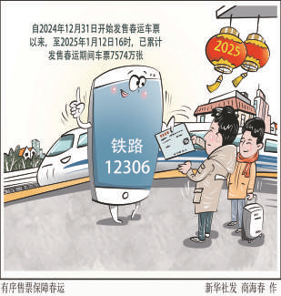 新华社北京电(记者 樊曦)记者从铁路12306科创中心获悉,自2024年12月31日开始发售春运车票以来,至2025年1月12日16时,已累计发售春运期间车票7574万张。
