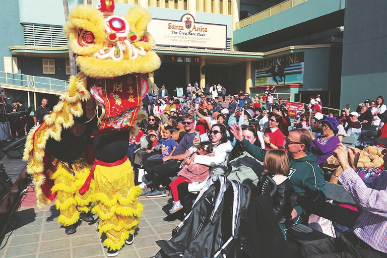 2月1日,演员在美国阿卡迪亚市举行的春节庆祝活动上表演舞狮。 新华社发 邱晨 摄