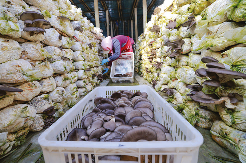 2月24日,河北省唐山市丰南区东田庄镇大吴庄村农民在大棚内采摘平菇。