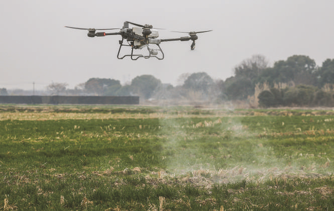 2月25日,在嘉兴市南湖区凤桥镇星火村,种植户操作植保无人机实施杂草防治作业。眼下,在浙江省嘉兴市南湖区的多个农场内,无人机、自动喷洒机、自动旋耕机等农业自动化设备在进行翻地、播种、灌溉等多项任务,助力春耕春种。