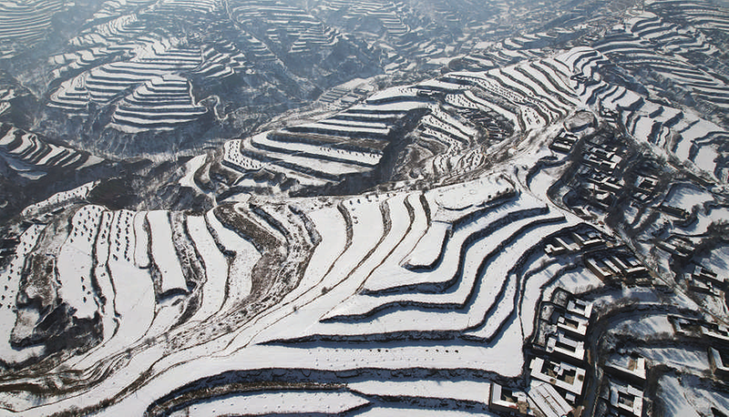 当日,一场春雪过后,甘肃省临夏回族自治州东乡族自治县境内的梯田和山峦被勾勒出“大地的指纹”。新华社记者