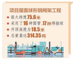 该项目屋面球形钢网架工程最大跨度75.6米,采用了16种圆管、17种焊接球,升顶高度为18.5米,总重量达314.35吨,属于超危大工程。面对复杂工艺和紧迫工期,项目技术负责人王国强和团队反复研讨施工方案,不断优化细节,构建BIM+智能建造体系,用Tekla软件对五边形梁柱节点进行毫米级建模,最终采用分段组装、挠度控制与高空拼装相结合的安装方法,解决了难题。项目施工过程中应用了《建筑业10项新技术》中的10个大项33个子项。项目部科学调度,精心部署,将安全、技术、质量、进度、成本等工作目标分解到年、月、周进行动态管理,同时采用劳动竞赛方式,激发各劳务班组工作激情,全面掀起建设热潮。