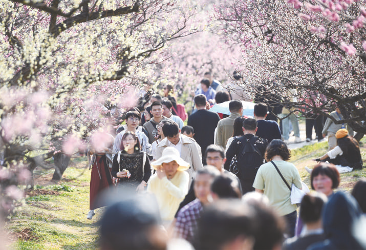 3月1日,众多游客在南京梅花山景区赏花游玩。