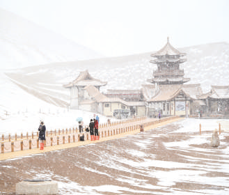 3月26日,游客冒雪游览甘肃省敦煌市鸣沙山月牙泉景区。3月26日,甘肃省敦煌市迎来降雪,鸣沙山月牙泉景区银装素裹,景色如画。