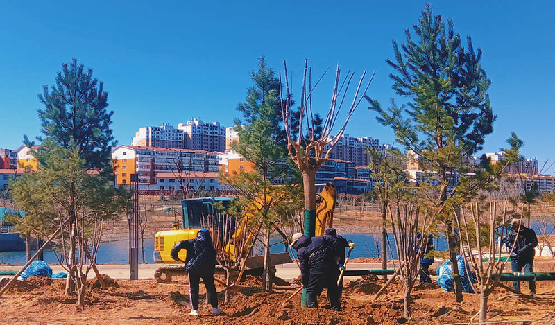 阳春三月,万物复苏,眼下正是栽种树木的好时节。图为在七里河生态环境综合治理二期工程施工现场,工人们配合着机械种植大型乔木灌木。 赵福胜 摄