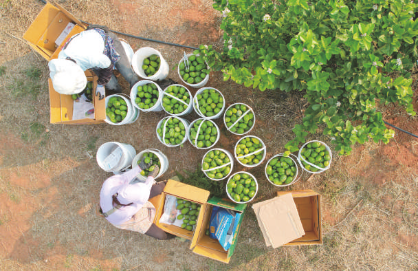 3月31日,果农在瑞丽瑞垦巍小檬户兰香水柠檬高标准种植示范基地打包刚采摘的柠檬。