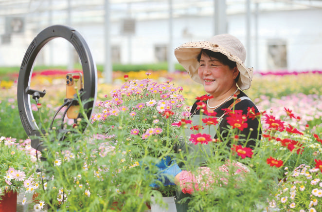 4月13日,花农在即墨区灵山街道百亿绿洲花卉种植基地通过电商直播销售花卉。近年来,山东省青岛市即墨区灵山街道以现代设施农业为抓手,推动花卉产业集约化发展,依托“龙头企业+合作社+农户”联农带农机制,打造集组培育苗、现代化种植、电商销售于一体的产销模式,为农业高质量发展注入新活力,促进农民增收,助力乡村振兴。 新华社发 梁孝鹏 摄