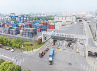 4月17日,在重庆国际物流枢纽园区,转运卡车在陆海新通道重庆无水港转运装有玻璃制品的集装箱。