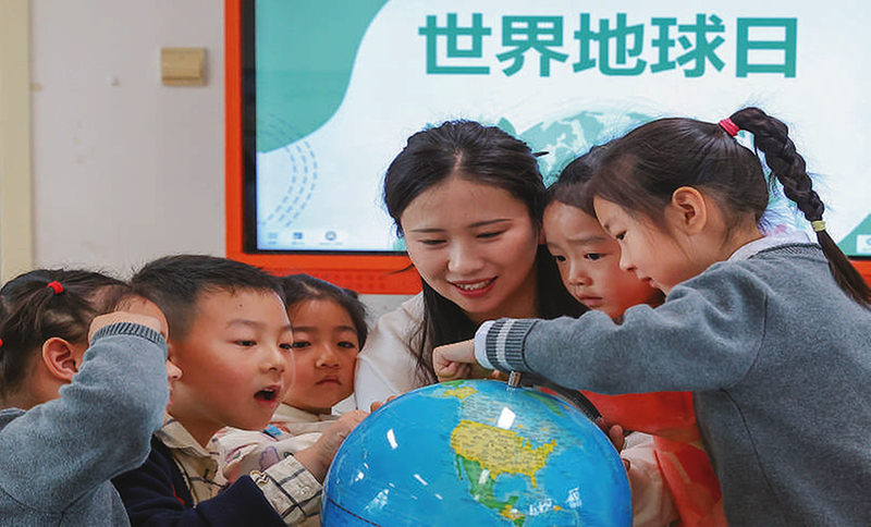 4月21日,在江苏省镇江市丹徒区驸马山庄幼儿园,老师指导孩子们认识地球仪。